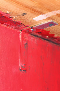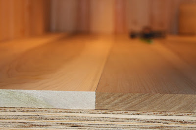 This process was really a two person job.... and you need some muscles, oh which, I don't really have...but I gave it my best shot. I held the end board down, flush with the edge, with as much pressure on the board as I could muster. My husband screwed from underneath, all the way down the board, into the plywood, and all the way into the poplar. Using short enough screws, to not poke through. For each piece we did the same thing. Trying to get them all level was the key, but some unevenness lends to the reclaimed look. I didn't want it to look like butcher block.