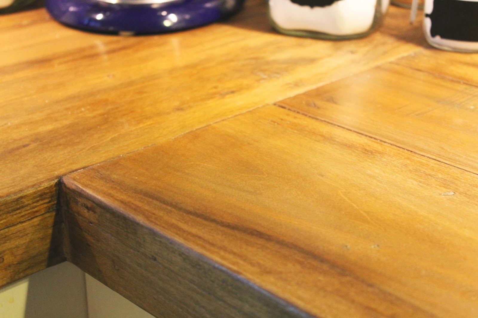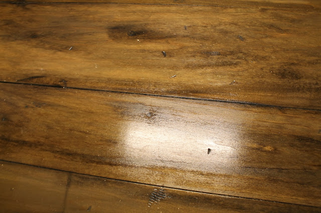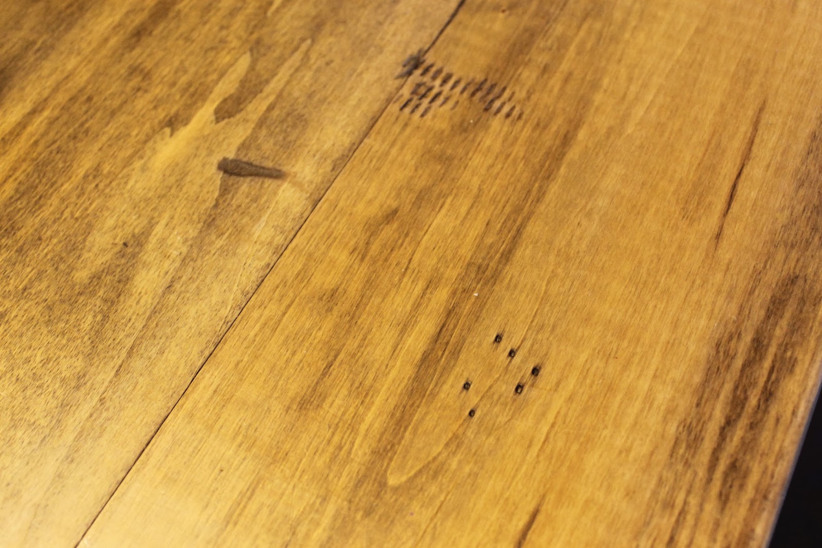Since reclaimed wood is roughed up, I used several kinds of tools, to bang up the top to give it an old look. This also helps, with the natural distressing the counters will receive from my family's mistreatment. We have had these counters for close to a year, and they have held up so well.